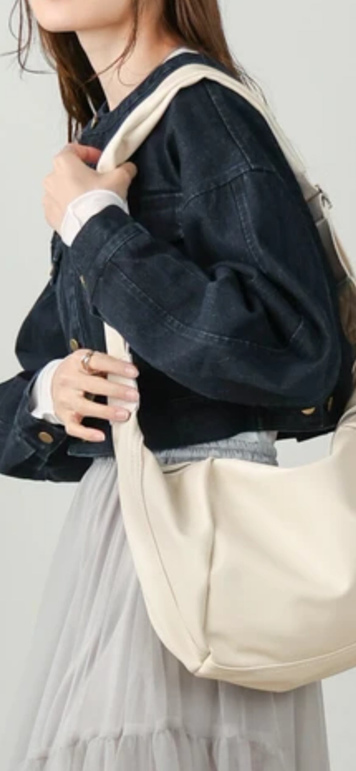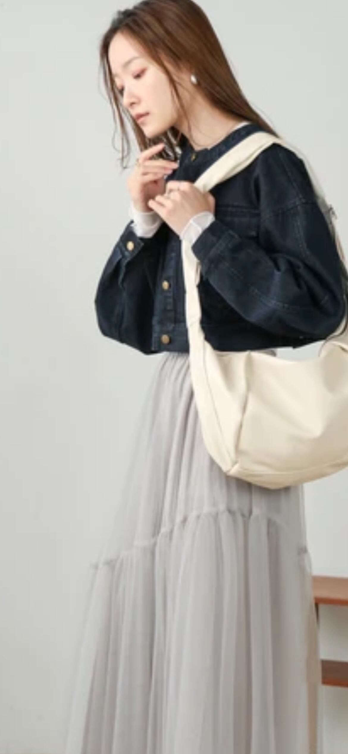 デザイン・カラーがシンプルでどんなコーディネートにも合わせやすいので、デニムのセットアップやキャミワンピース、チュールのスカートなど、デザインが入ったアイテムや、明るいカラーアイテムを使ったコーディネートに差し込むのがオススメです。スニーカーにスウェットやカットソーを合わせて、カジュアルスタイルにも使えます。
