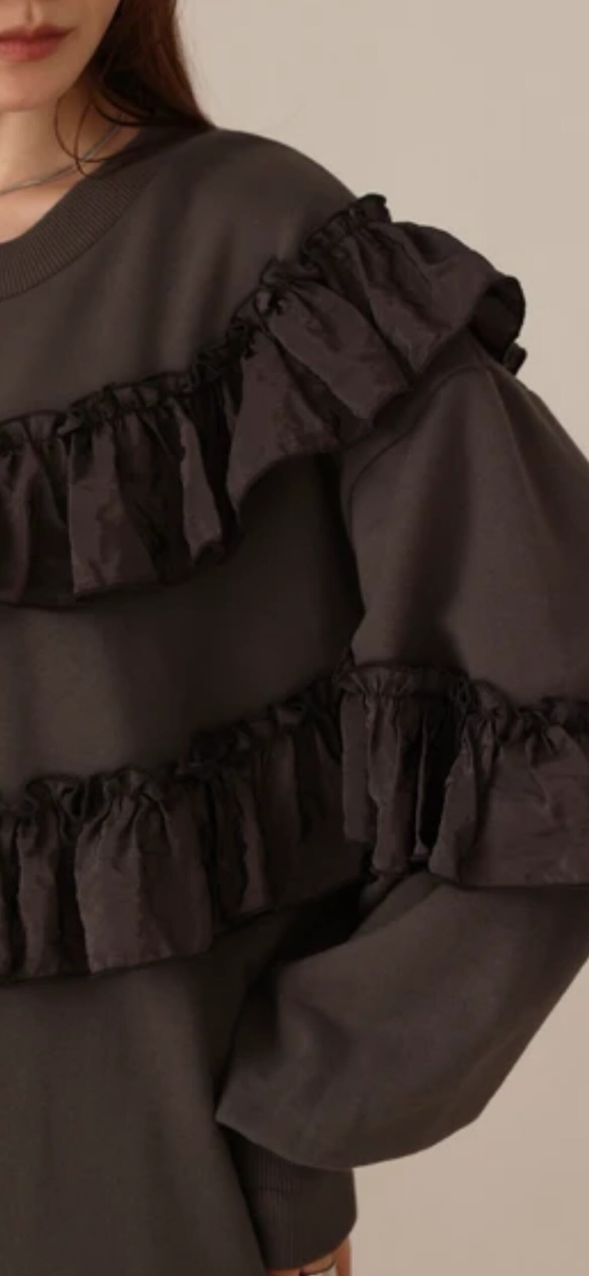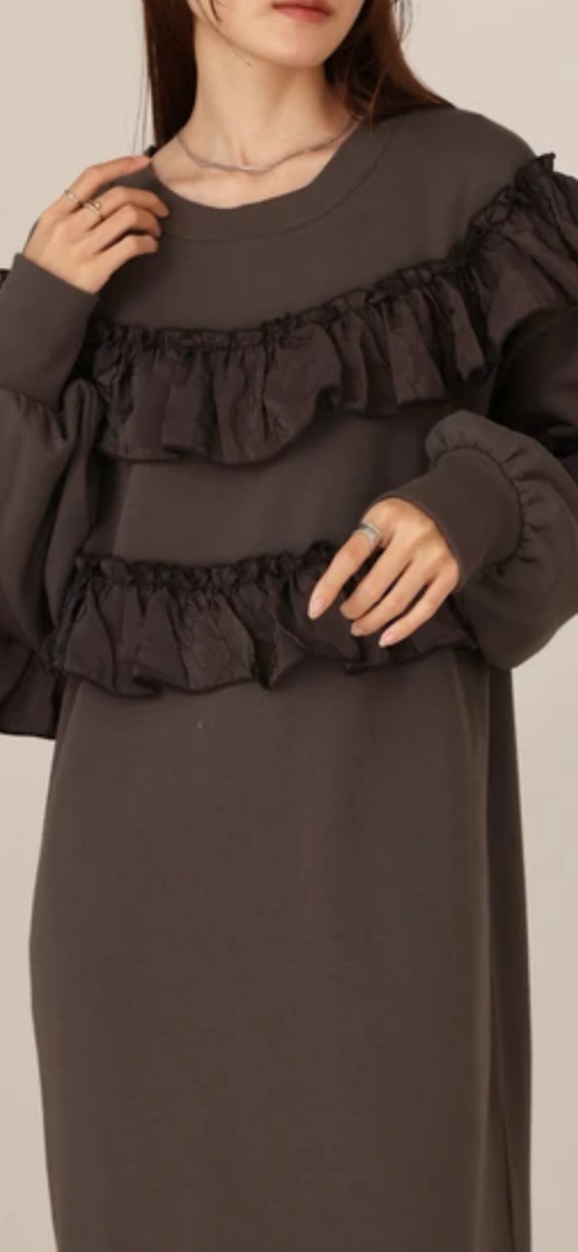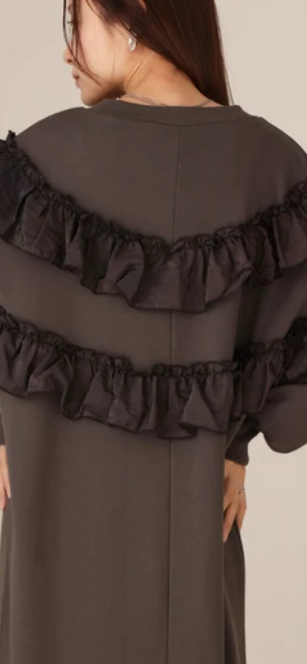 カジュアルな着心地を提供する裏毛素材でロングシーズンお楽しみ頂けます。フリル部分は高級感をプラスするクラッシュサテンです。