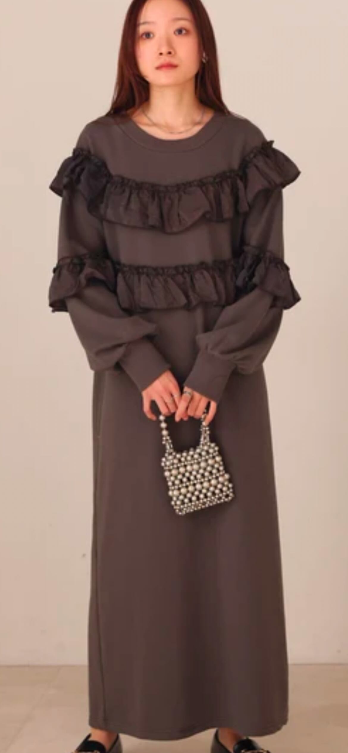 さっと1枚着るだけでサマになるシャレ見えワンピース!ローファーとミニバッグでキレイめに決めれば、年末のお出掛けにもOKな上品レディに。キャップやスニーカーのカジュアルアイテムにも 気軽な裏毛生地で馴染んでくれます。2段のサテンフリルが大人のフェミニンスタイルに華を添えてくれます。
