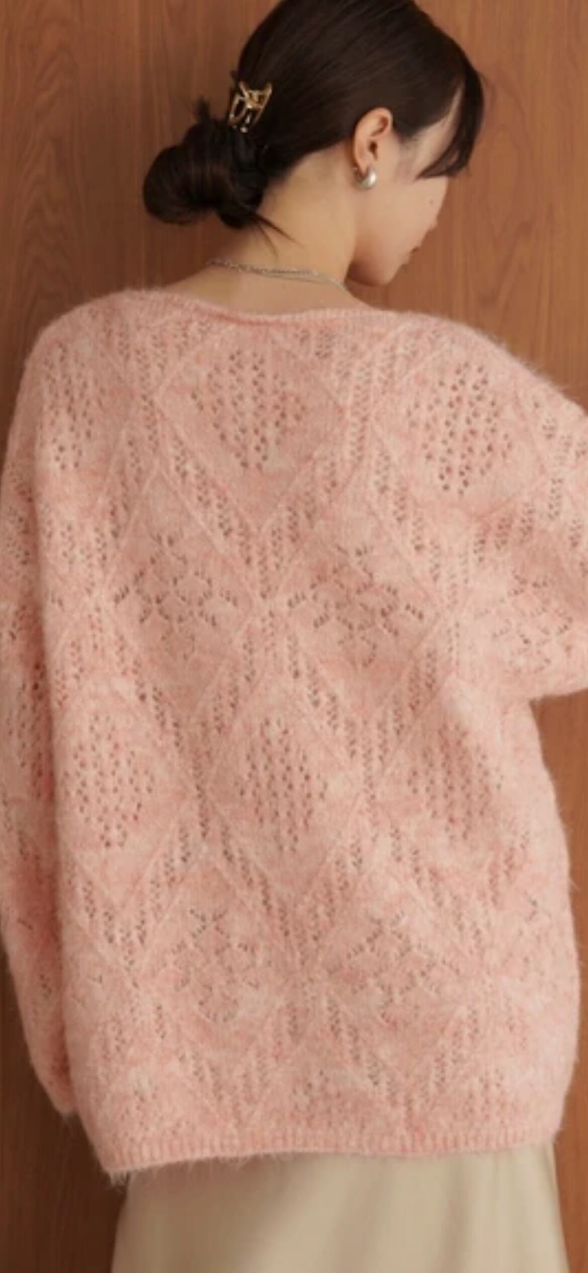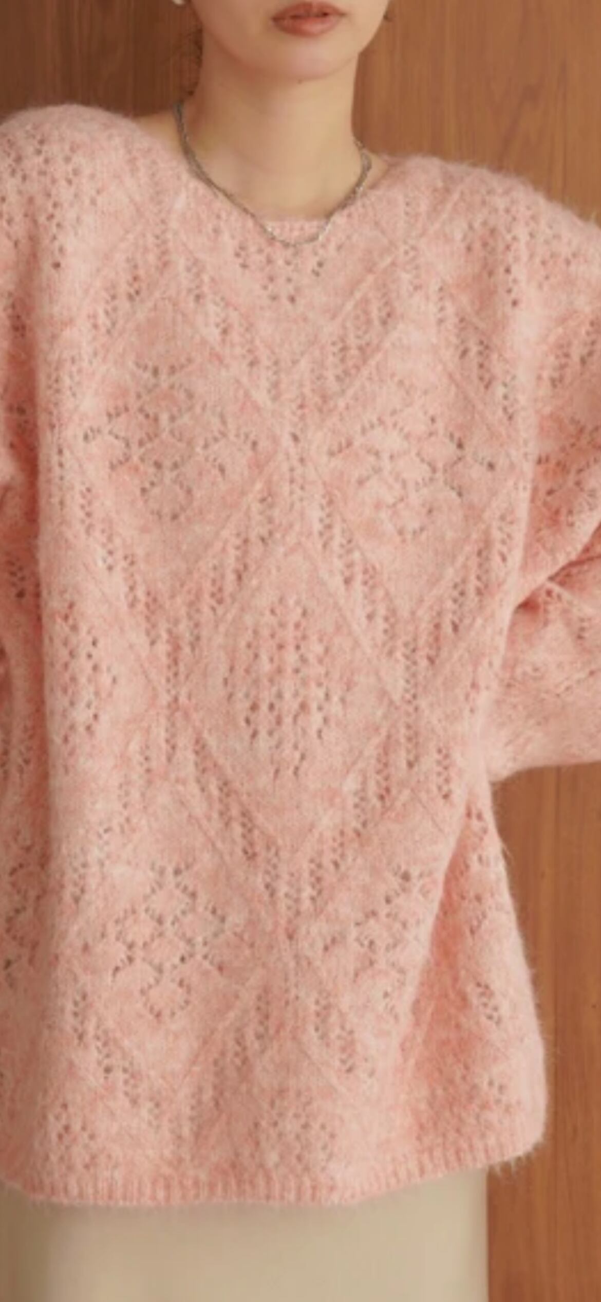 ニュアンシーなメランジニットでダイヤ柄の模様編みを施したニットトップス!他には無い複雑なカラーで華やかさが際立つ逸品です。ボディラインを気にせずお召し頂けるサイズ感とヒップラインが隠れる着丈も大人女子に嬉しいポイント。薄手の生地感なので オーバーシルエットでも着ぶくれ感が無く、美しい編み柄を堪能できます。