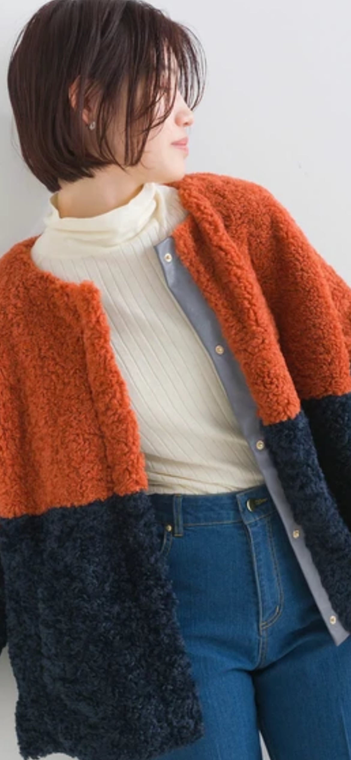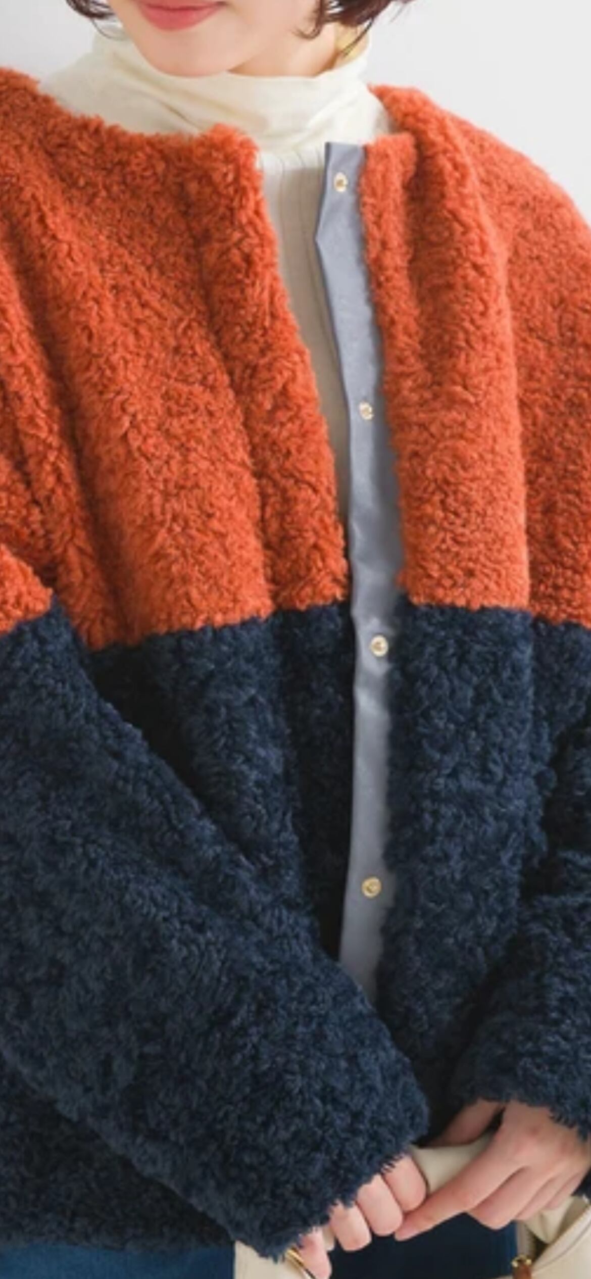 バイカラーデザインが目を惹くファージャケット。