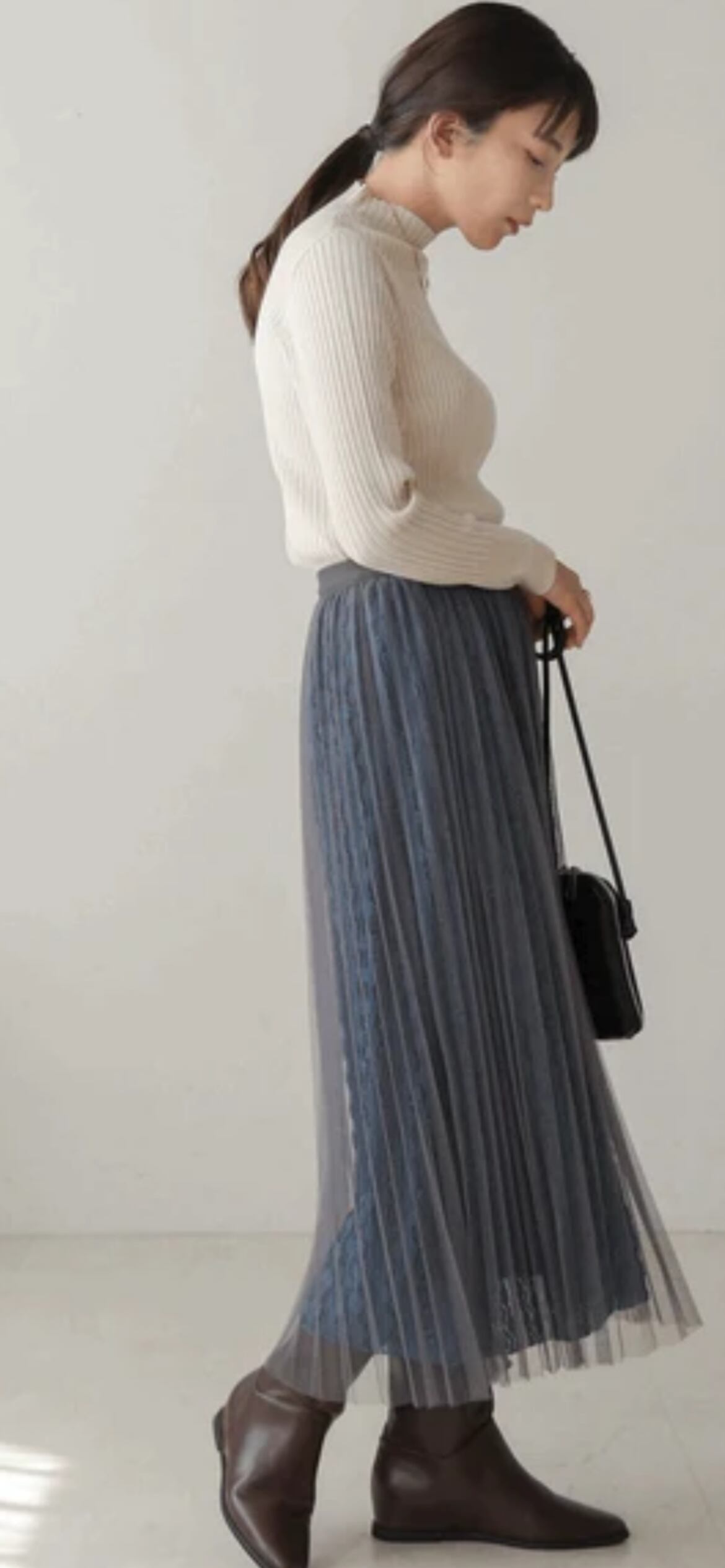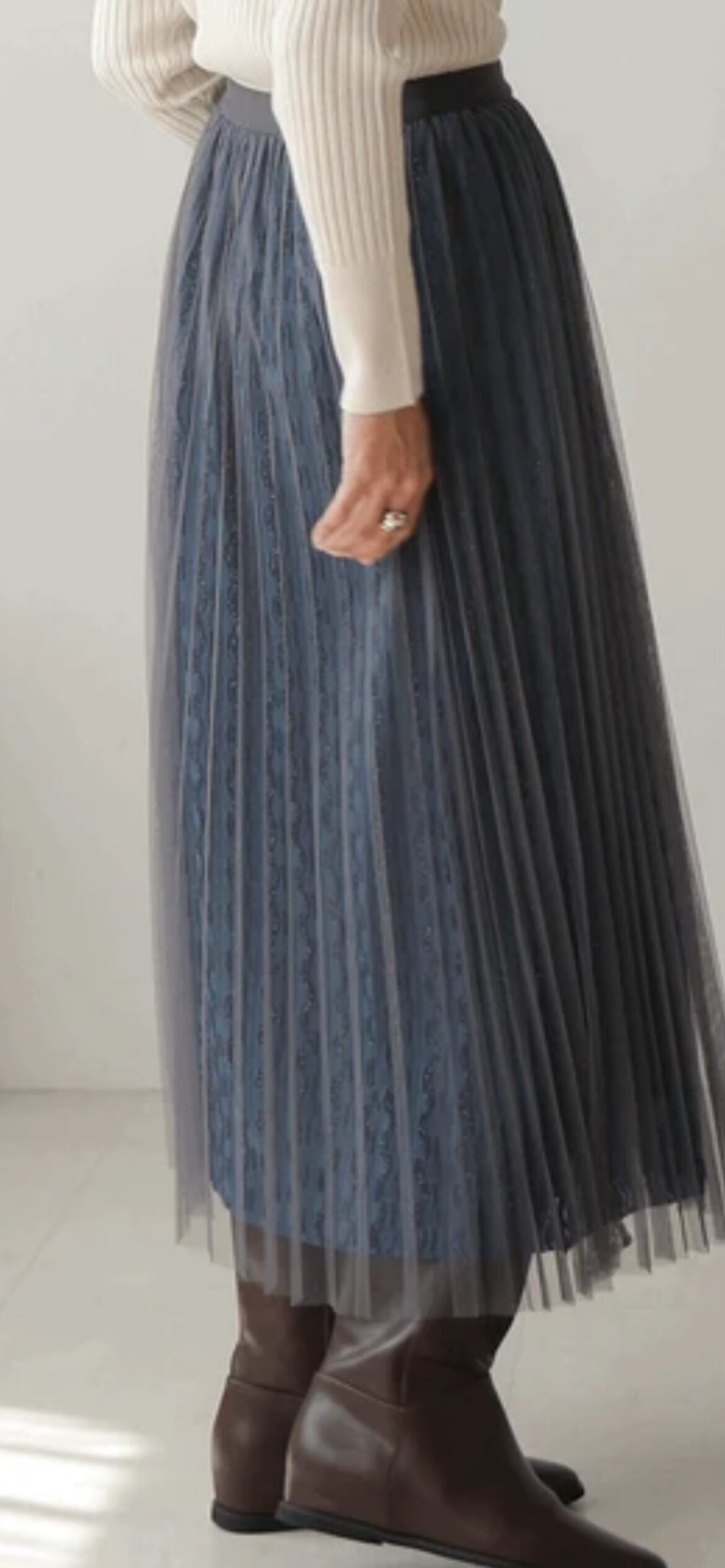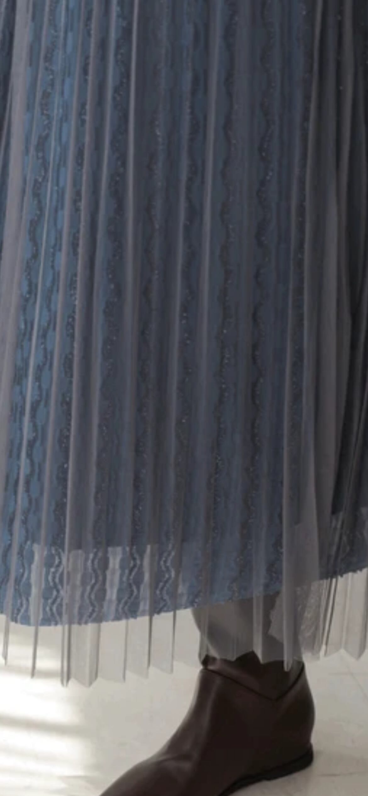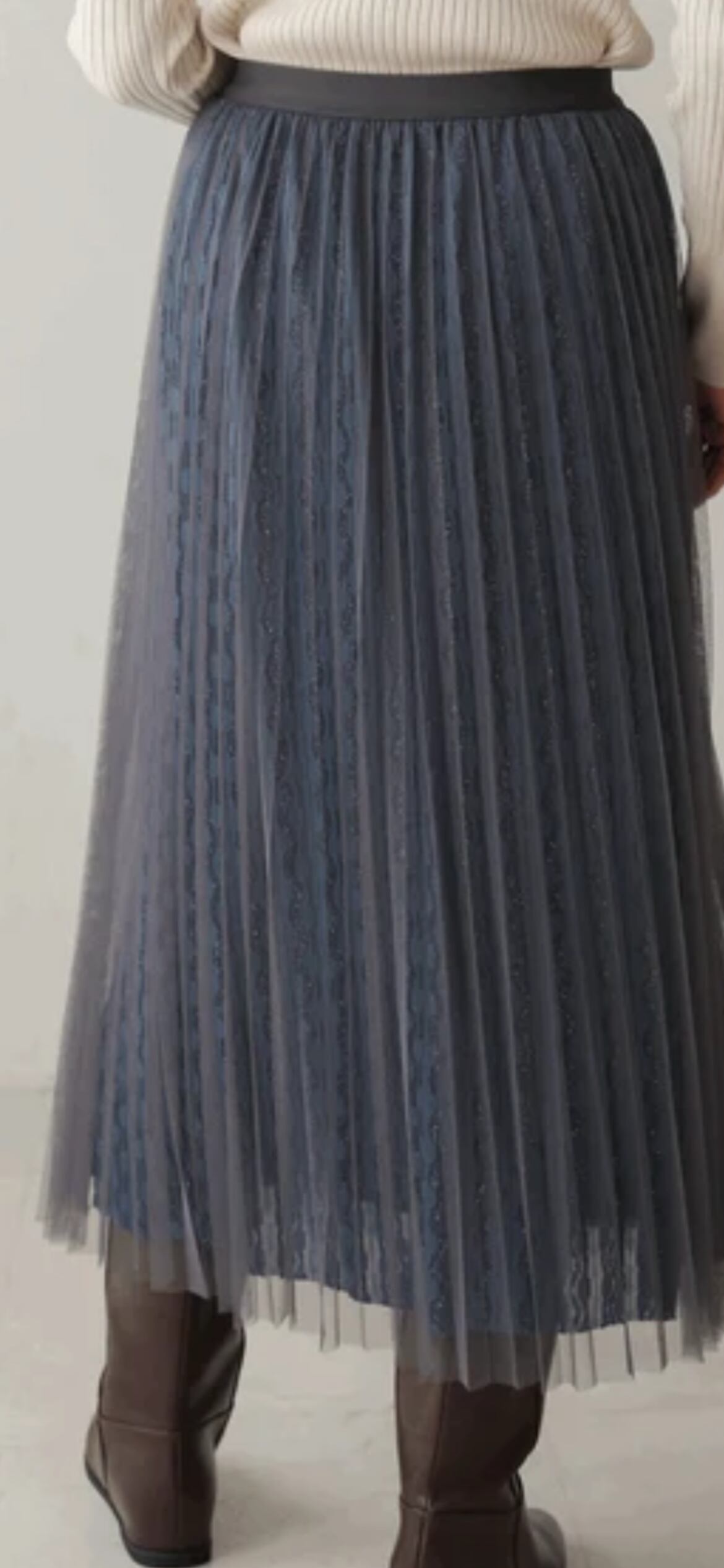 チュールにはプリーツ加工が施してあり、下のラメレース光沢感が歩くたびに華やかな印象を与えてくれます。