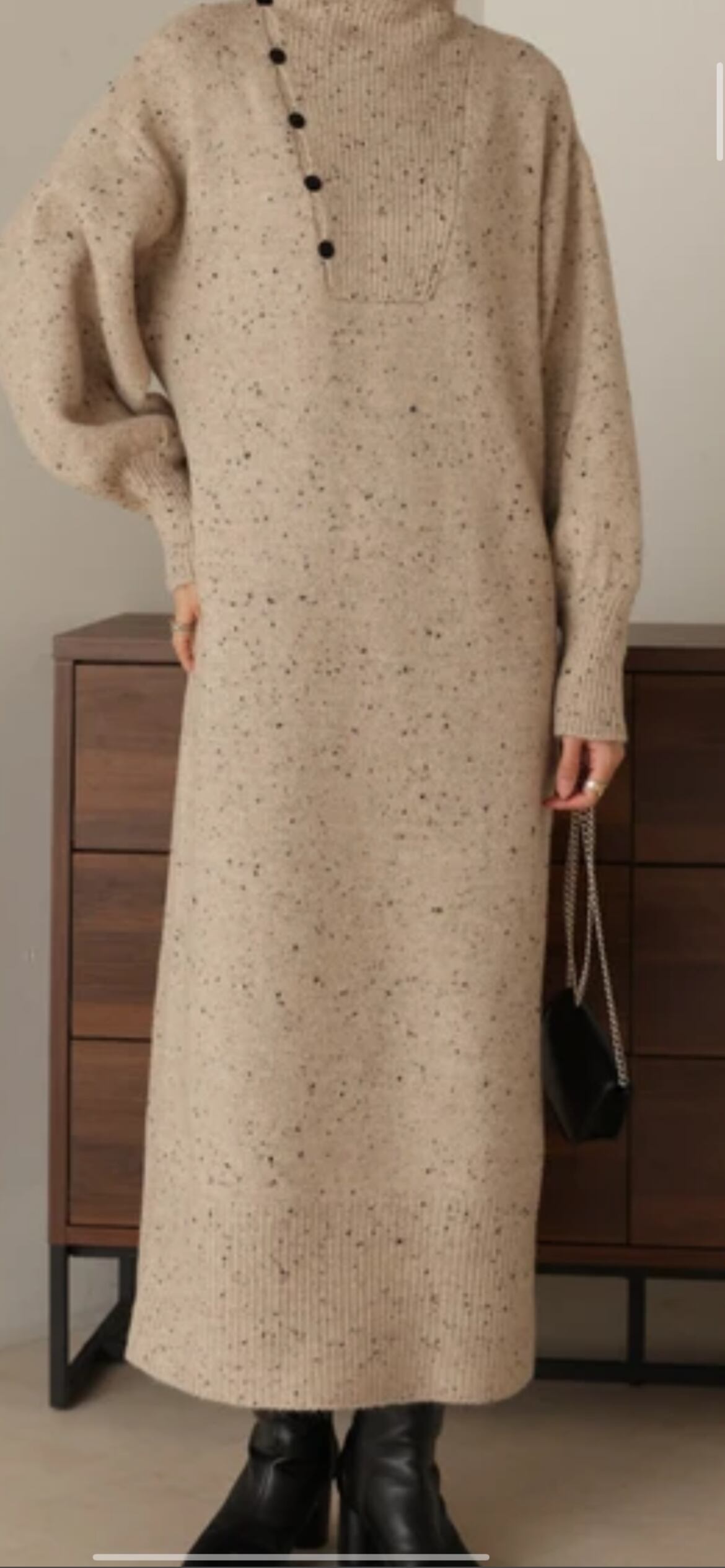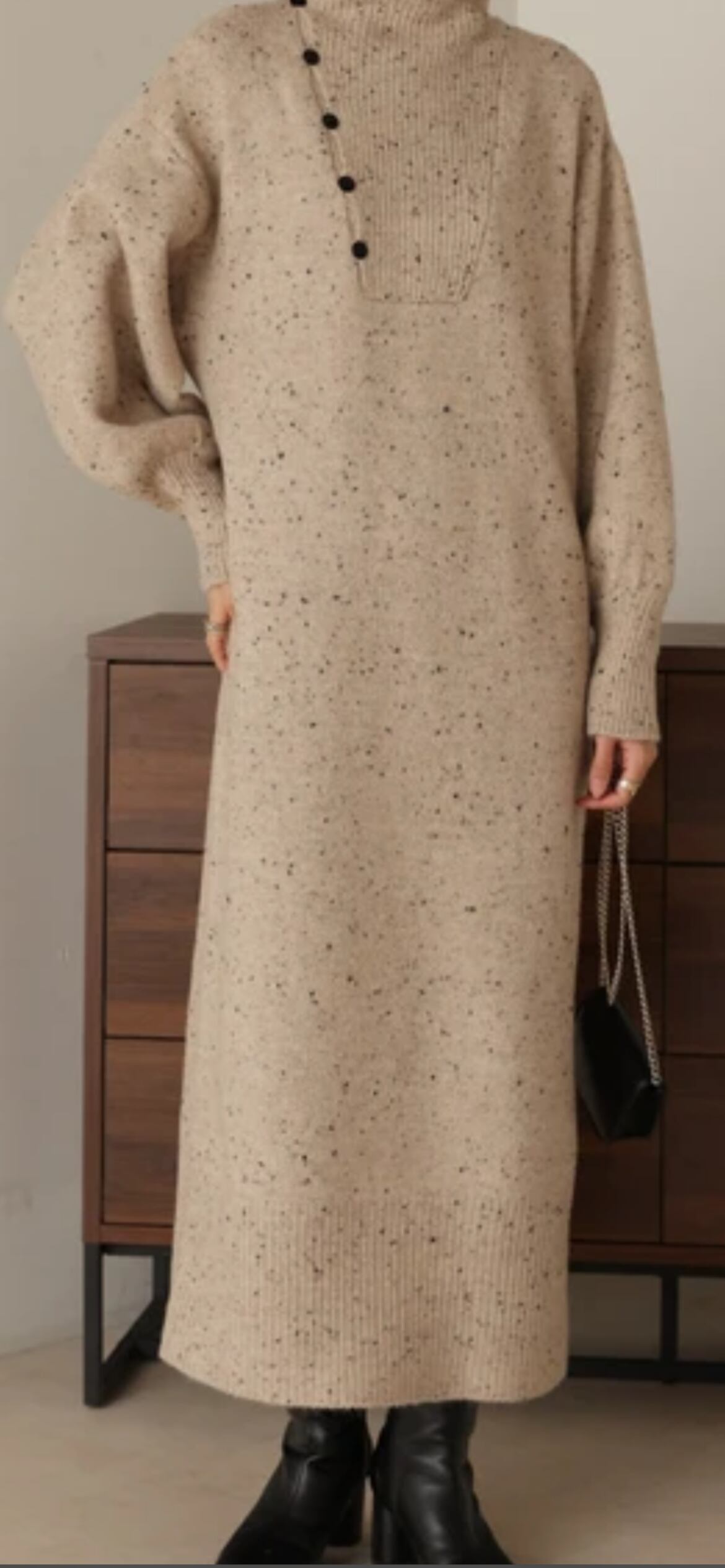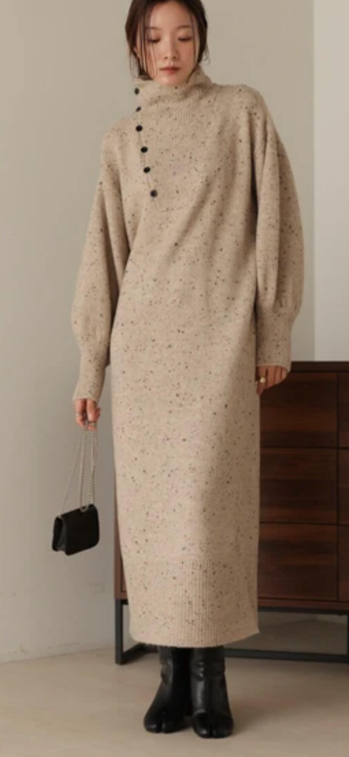 ポコポコのネップがチョコチップのように浮き出る可愛らしいワンピースが登場!体のラインを拾いすぎないストレートシルエットが魅力的です。アクセントになる首元のボタンを全て留めると、知的な印象のタートルネックで締め付け感がありません。上から2つほどはずして襟を出せば、抜け感が出てで着ぶくれ防止にもなります。トレンドのサムホール付きの袖と足首まですっぽり被さるロング丈で、寒い日にもしっかり暖かくしてお出掛けできます。小柄さんにも嬉しいSサイズもご用意致しました。