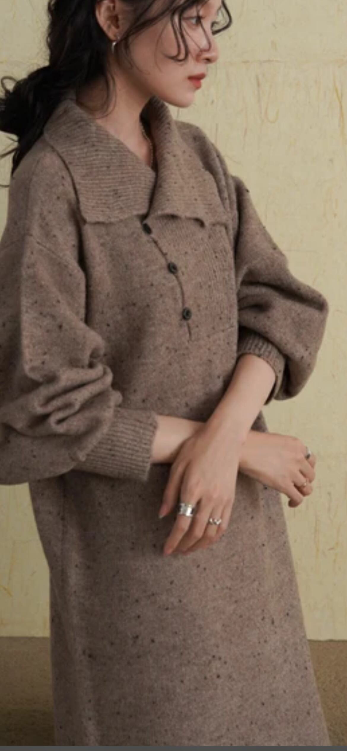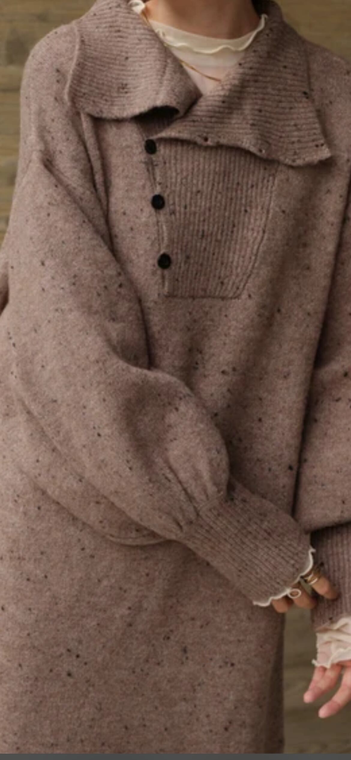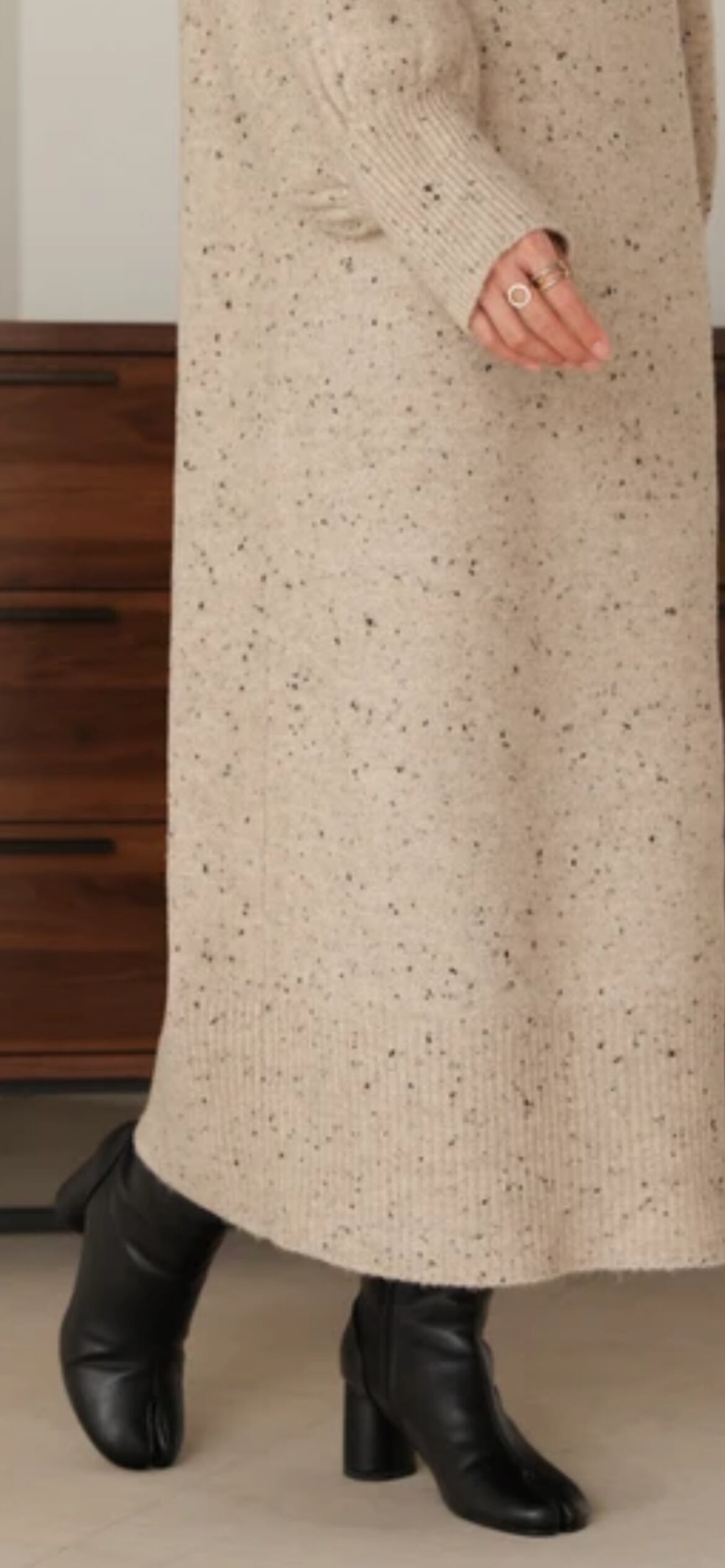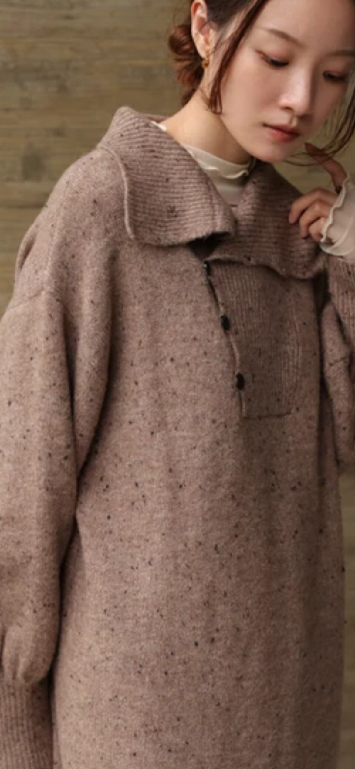 ポコポコのネップがチョコチップのように浮き出る可愛らしいワンピースが登場!体のラインを拾いすぎないストレートシルエットが魅力的です。アクセントになる首元のボタンを全て留めると、知的な印象のタートルネックで締め付け感がありません。上から2つほどはずして襟を出せば、抜け感が出てで着ぶくれ防止にもなります。トレンドのサムホール付きの袖と足首まですっぽり被さるロング丈で、寒い日にもしっかり暖かくしてお出掛けできます。小柄さんにも嬉しいSサイズもご用意致しました。