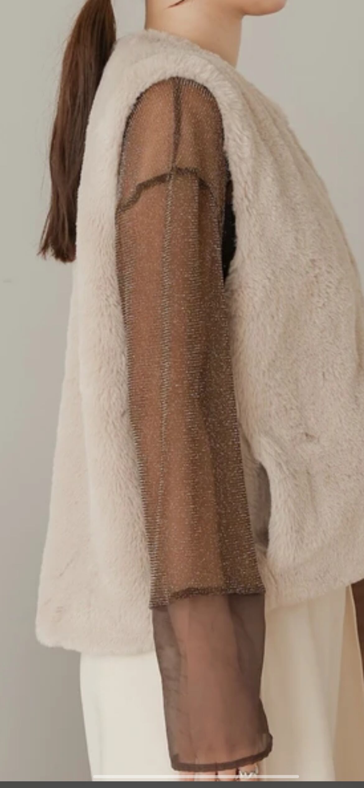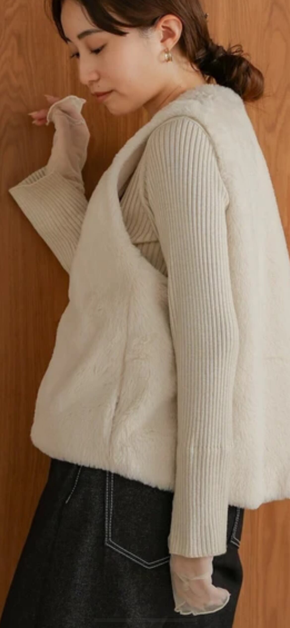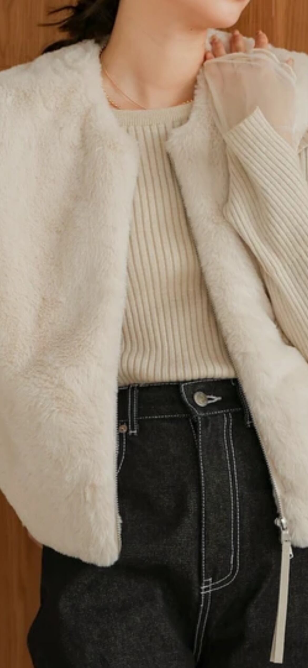 なめらかなラビット調の素材を使用。ふわっと軽く、肌触りも優しく、寒い日でも心地よく過ごせます。