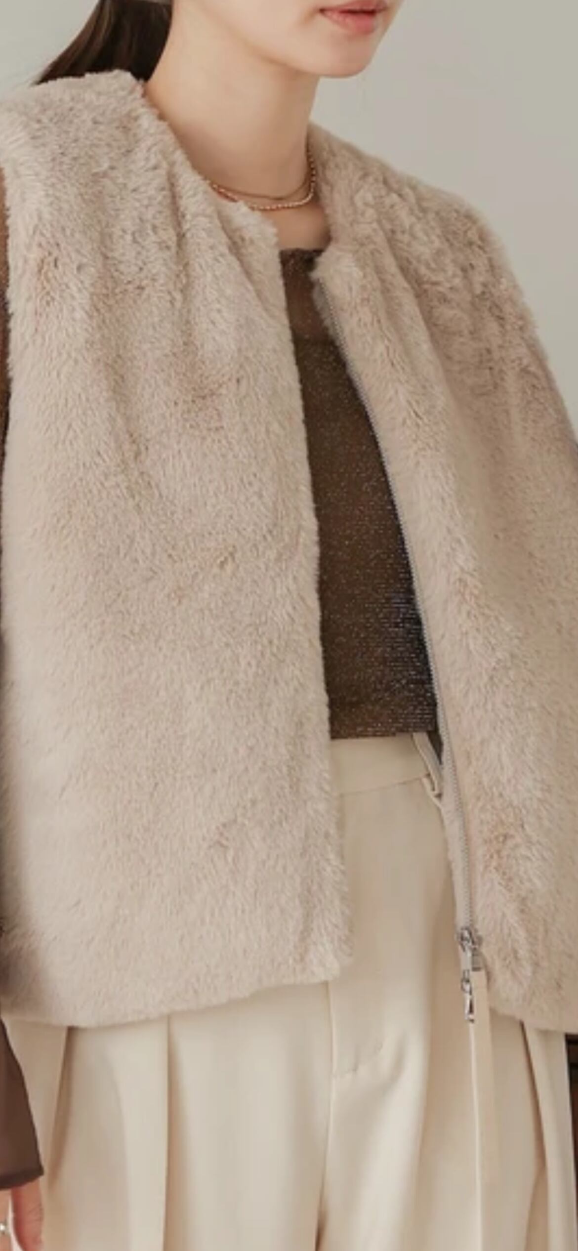 秋冬のコーデに自然な可愛さを添える、ラビット風のふわふわベスト。触れるたびにほっとするその質感は、寒い季節でも心まで暖かくしてくれます。シンプルなデザインながらも、フロントのダブルジッパーがアクセントに。タウンユースはもちろん、アウトドアなシーンにもフィット。軽やかな印象で、さっと羽織るだけで大人っぽい可愛らしさが引き立ちます。