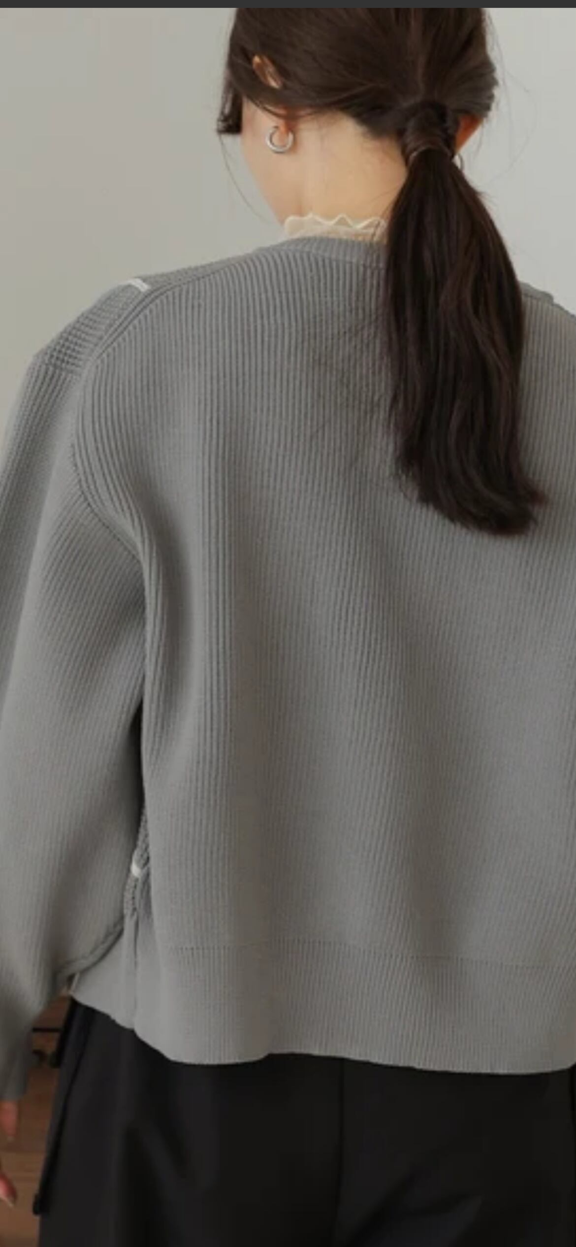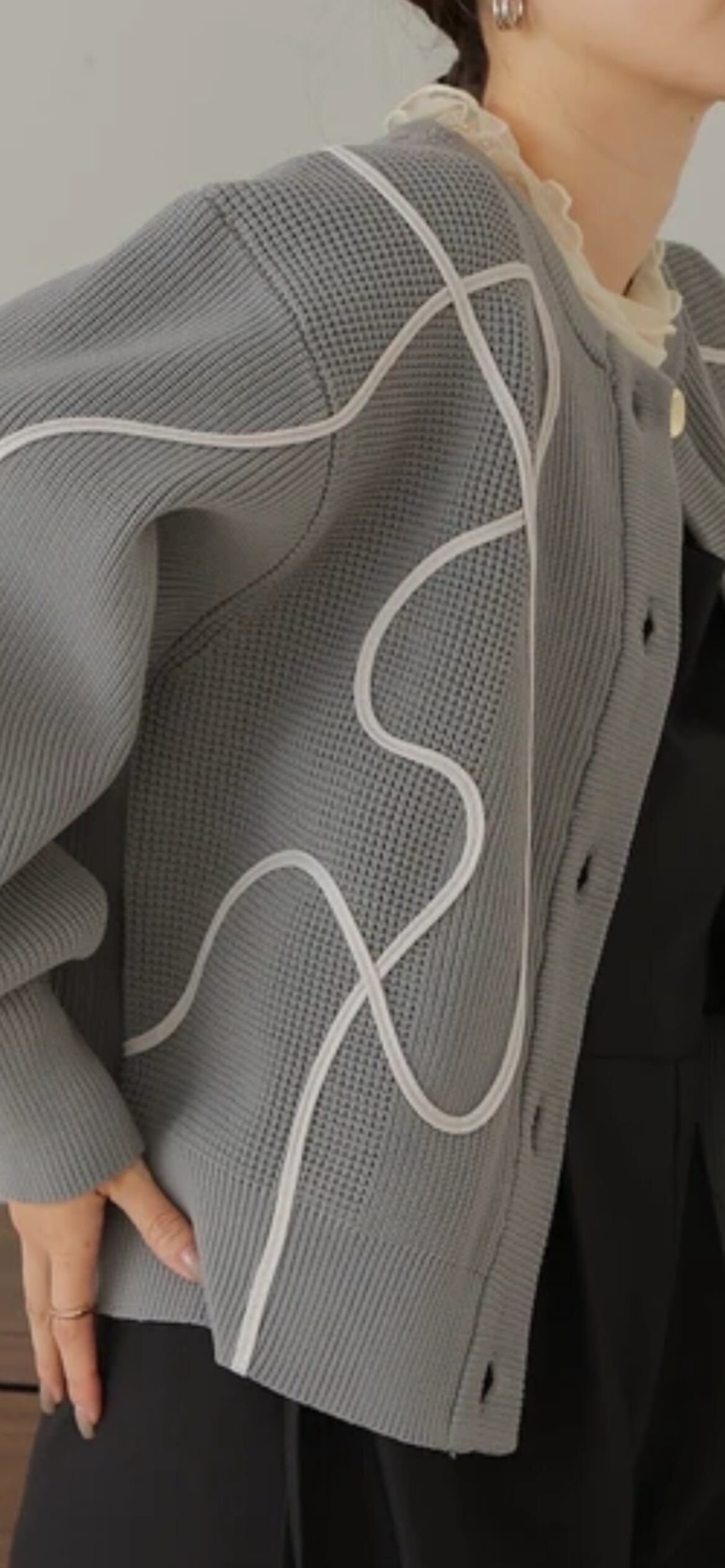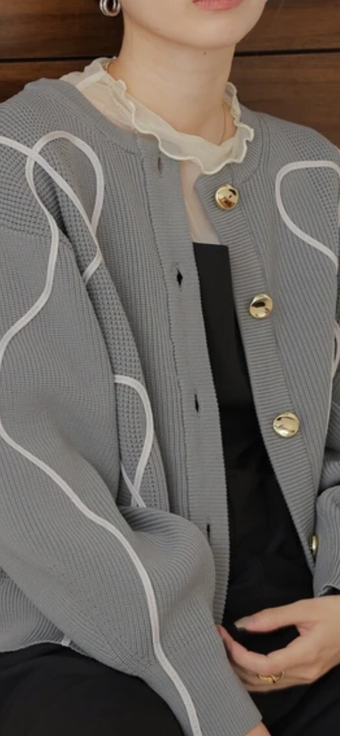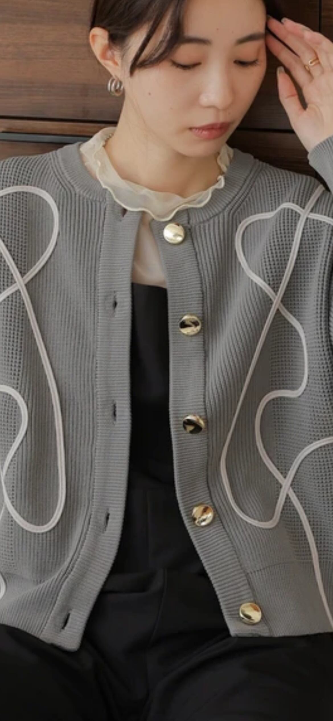 美しいフォルムが魅力的なスポンディッシュニットでアイコニックなカーディガンが出来上がりました!まるでメッシュのような表面感のある編み地が表情豊かで、ライトな優しい風合いを生み出します。ニュアンス感をUPさせるコード刺繍がフロント全面にあしらわれ、大き目のゴールドボタンも高級感溢れるアクセントに。コンパクトな着丈ながら脇ぐりを広くとった余裕のあるサイジングで、洗練されたデザインと抜け感を両方満喫できる1枚になりました。