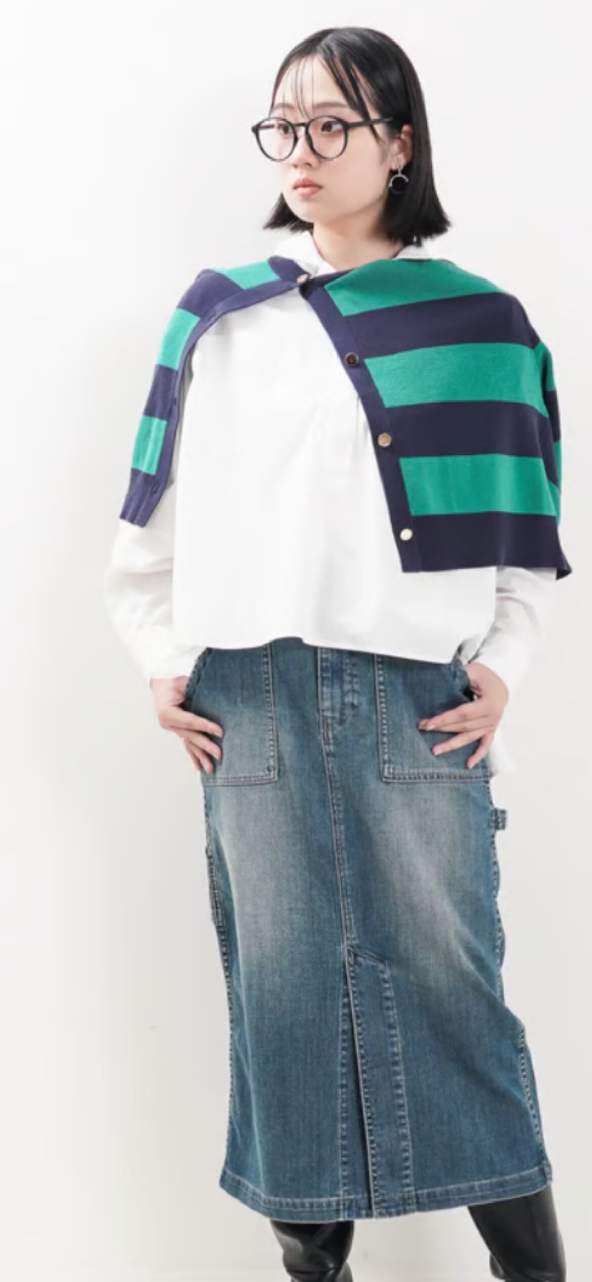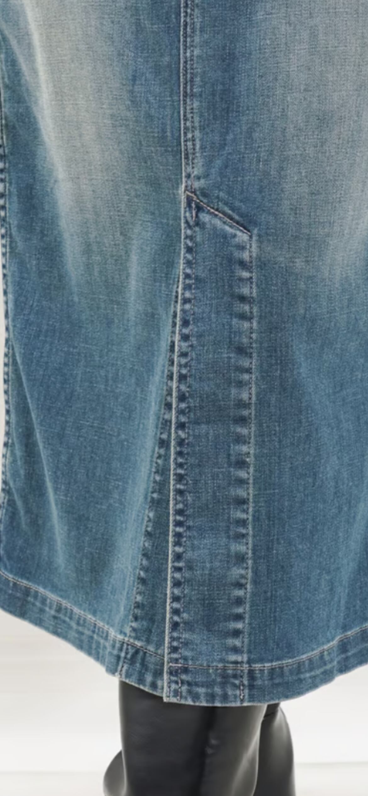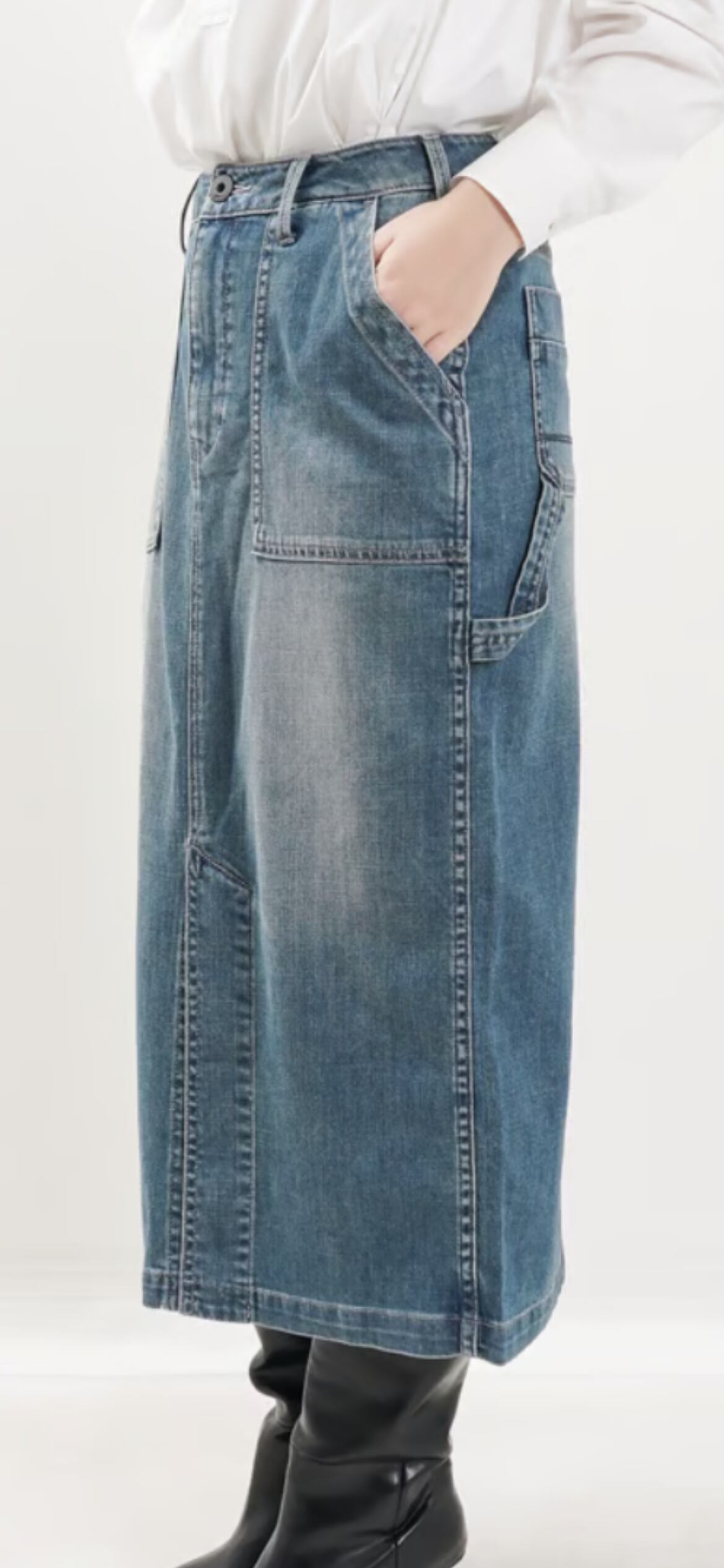女っぽくカジュアルアップできるデニムタイトスカート。フロントのベンツあきやビッグポケットでトラッド感を加え、接ぎに施したステッチの当たりがビンテージ感を醸し出します。バックポケット下のベルト使いやアシメポケットも他にはないこだわりポイント。コーディネートを一気にハンサム顔に仕上げてくれる1着です。